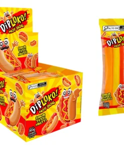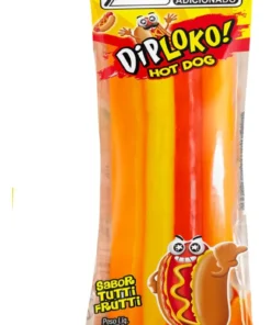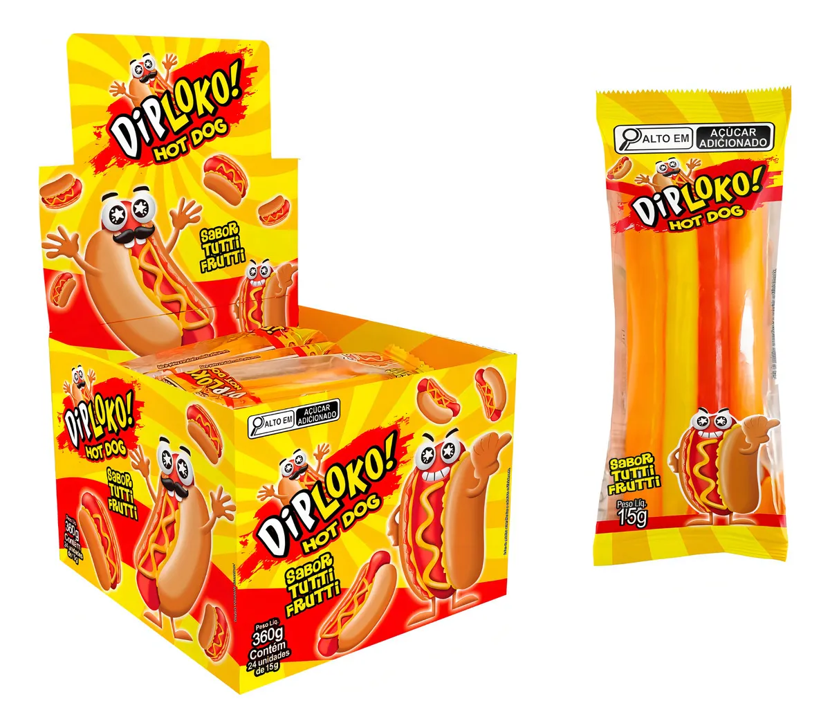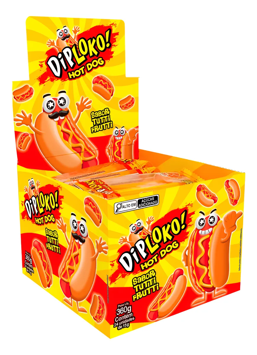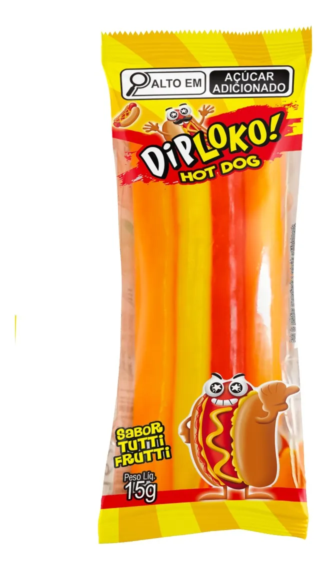 Garanta já o seu e aproveite essa novidade que está conquistando todos os paladares! Formato divertido de hot dog Os ingredientes do hot dog se separam ao puxar! Irresistível sabor de Tutti Frutti Ideal para festas infantis Perfeito para sacolinhas surpresa Sabor: Tutti Frutti Marca: Danilla Foods Peso: 360g Quantidade: 24 unidades de 15g cada Ingredientes: xarope de glicose, açúcar, água, emulsificante gelatina, amido modificado, acidulante ácido cítrico, emulsificante pectina, regulador de acidez ácido málico, óleo vegetal de palma, estabilizante citrato de sódio, aroma artificial de tutti frutti e corantes artificiais (vermelho allura AC (INS129), amarelo tartrazina (INS 102), amarelo crepúsculo (INS 110), azul brilhante FCF (INS 133) e corante inorgânico dióxido de titânio (INS 171). Não contém glúten. Informações Nutricionais: Porção 15g (1 unidade) Valor Energético: 52 Kcal (3%) Carboidratos: 12g (4%) Açúcares Totais: 5,3g Açúcares Adicionados: 5,3g (11%) Proteínas: 0,9g (2%) Sódio: 2,3mg (0%) Não contém quantidades significativas de gorduras totais, gorduras saturadas, gorduras trans e fibras alimentares.