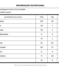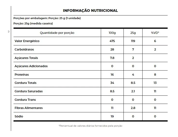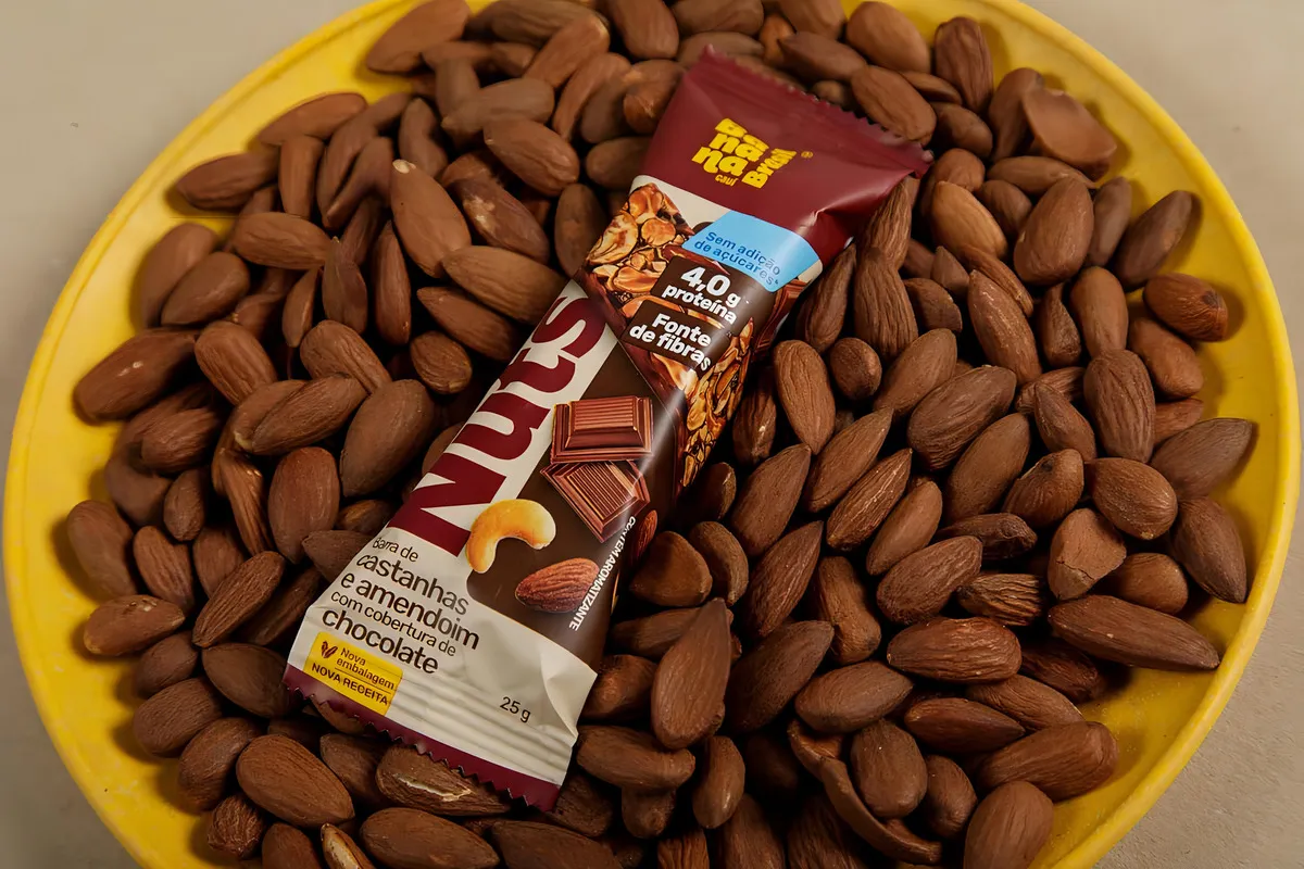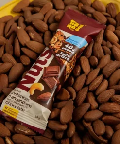 Amendoim, castanha-de-caju, suco de maçã concentrado, cobertura de chocolate ao leite sem adição de açúcares, amêndoa, fibra polidextrose, isomalto – oligossacarídeo de tapioca (fibra de tapioca), biscoito de cacau sem adição de açúcares, pasta de amendoim, cacau em pó, fibra goma acácia, antioxidante lecitina de girassol e aromatizante natural. ALÉRGICOS: CONTÉM AMÊNDOA, AMENDOIM, CASTANHA-DE-CAJU, LEITE E DERIVADOS DE AMENDOIM E DE LEITE. PODE CONTER AVELÃS, CASTANHA-DO-BRASIL, MACADÂMIAS, NOZES, PECÃS, PISTACHES E SOJA. CONTÉM LACTOSE. NÃO CONTÉM GLÚTEN.