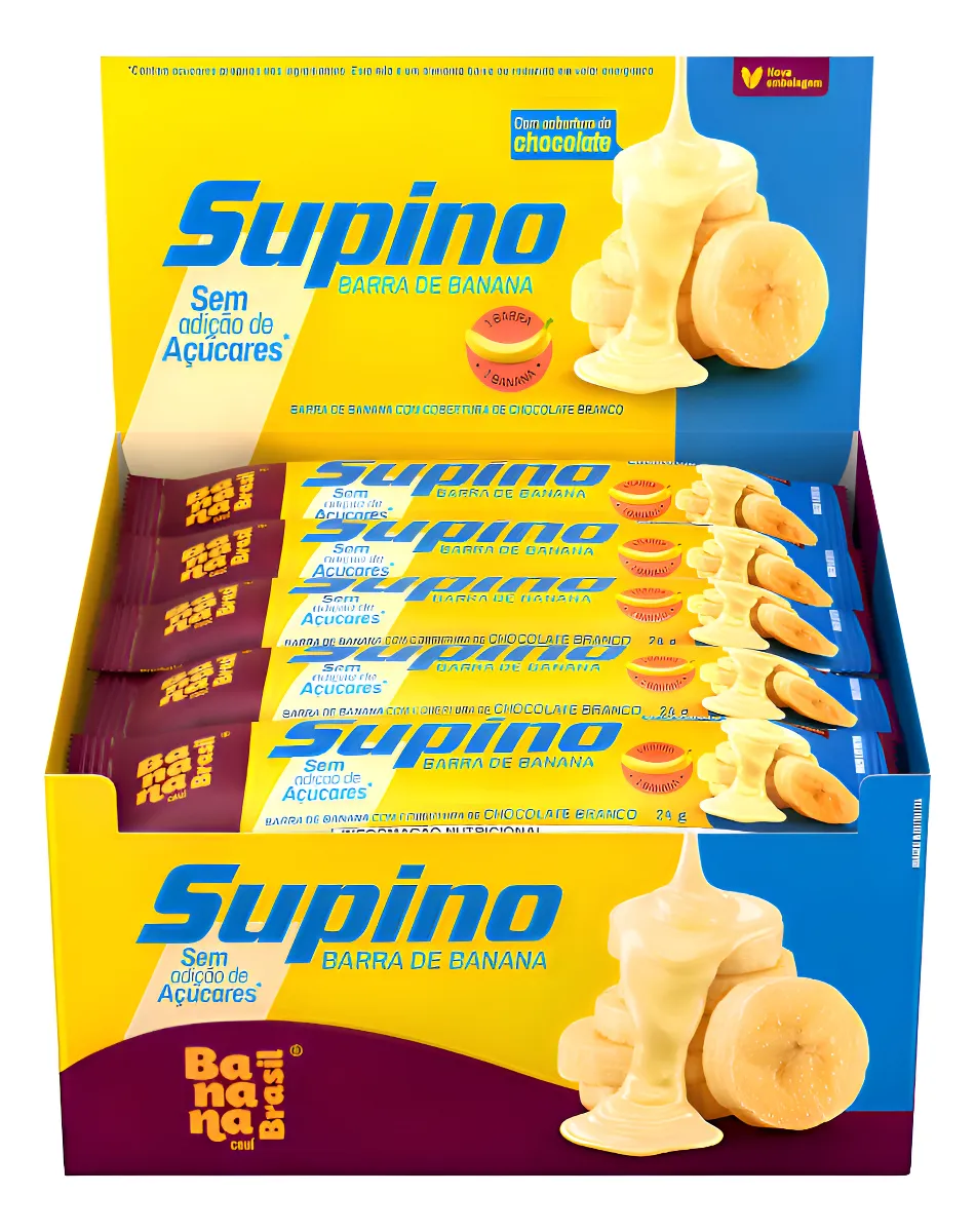 A linha Supino reúne os melhores ingredientes em opções nutritivas, práticas e saborosas. A combinação de banana-passa com uma deliciosa cobertura de chocolate promove saciedade, energia e sensação de bem-estar, já que a banana e o cacau contêm em sua composição o aminoácido essencial triptofano, que ajuda o organismo a produzir serotonina, um neurotransmissor que melhora o humor.