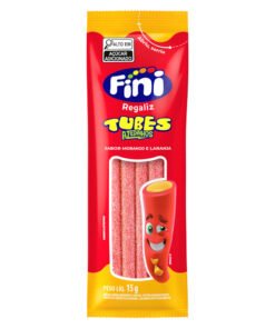 Tubes Morango com Laranja Cítrico, produto exclusivo da Fini no Brasil. Com formatos especiais e uma explosão de sabor, eles são irresistivelmente deliciosos, coloridos e ricos em detalhes. Disponíveis nas cores vermelho e laranja, oferecem o inconfundível sabor de morango e laranja, com um acabamento cítrico que vai surpreender o seu paladar.